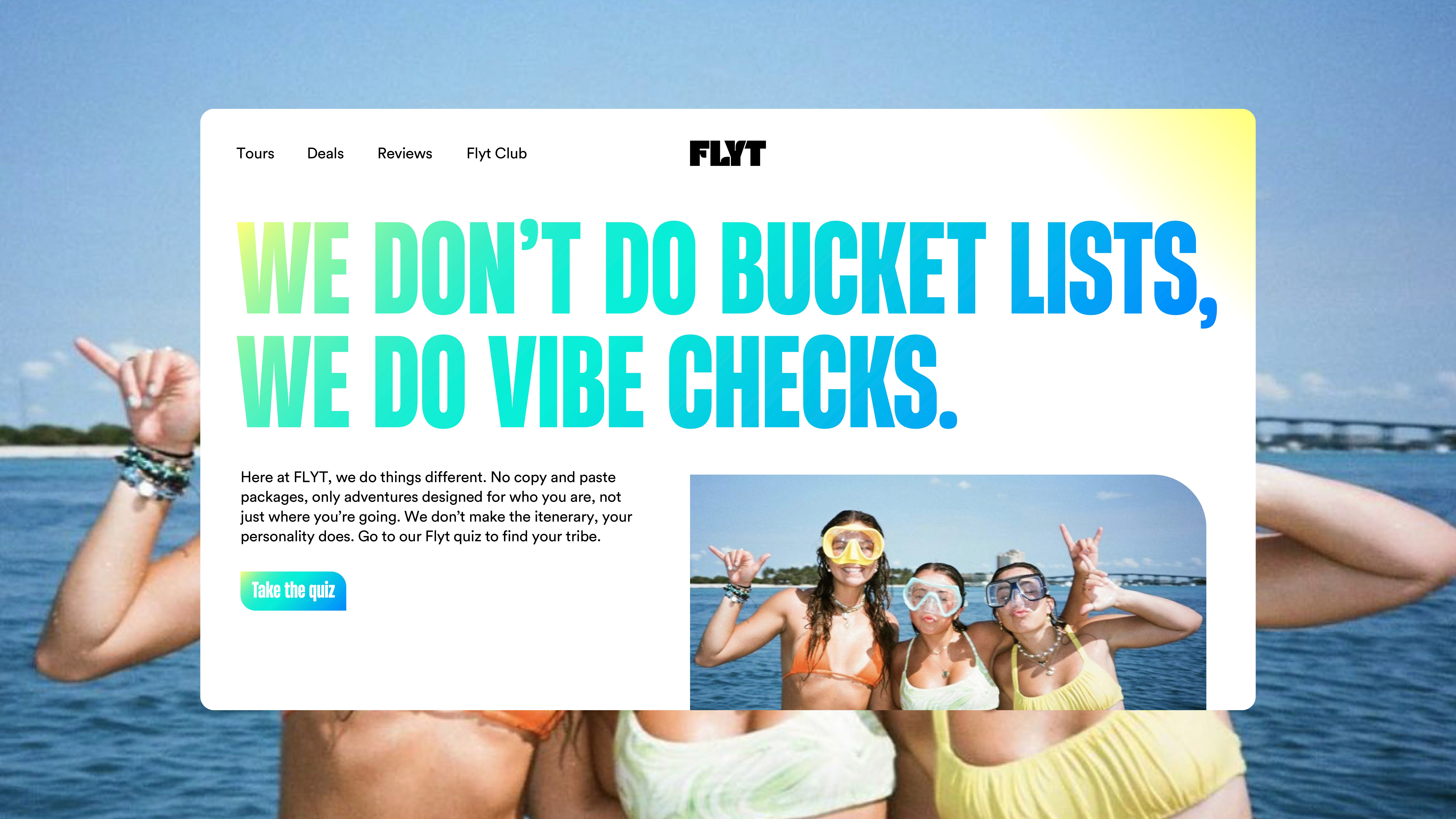 Breaking away from the traditional model of activity-led itineraries, Flyt curates group packages built around personality and lifestyle. Whether you’re a laid-back beach goer or a culture enthusiast, the focus is on finding your vibe and your tribe. Designed with Gen Z in mind, Flyt leans into a playful, energetic identity, pairing bold visuals with authentic traveller imagery to carve out a space that feels fresh, cheeky, and distinctly different from its competitors.